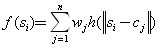 Sa cj označavamo centre radij-funkcije h. Budući da se u najjednostavnijem slučaju za centre funkcije uzimaju upravo točke iz početnog skupa za ucenje, gornja formula prelazi u: